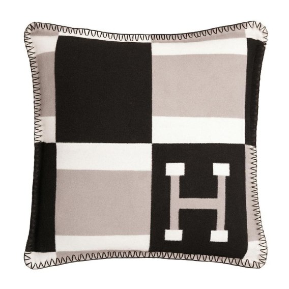 Geometryczny wzór z literą "H" oraz ozdobne, kontrastowe czarno-szare obszycie dodają charakteru i stylu.