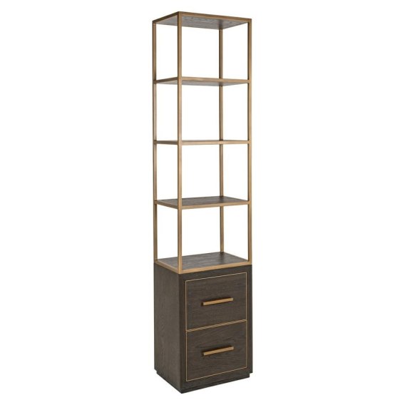 Wysoka, smukła konstrukcja opiera się na metalowym stelażu w odcieniu szczotkowanego mosiądzu, który harmonijnie kontrastuje z ciemnym fornirem dębowym.